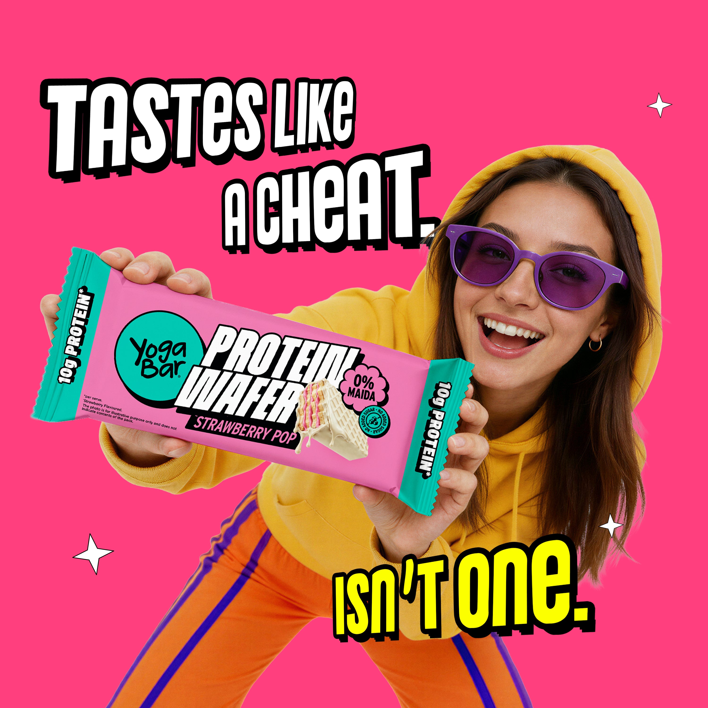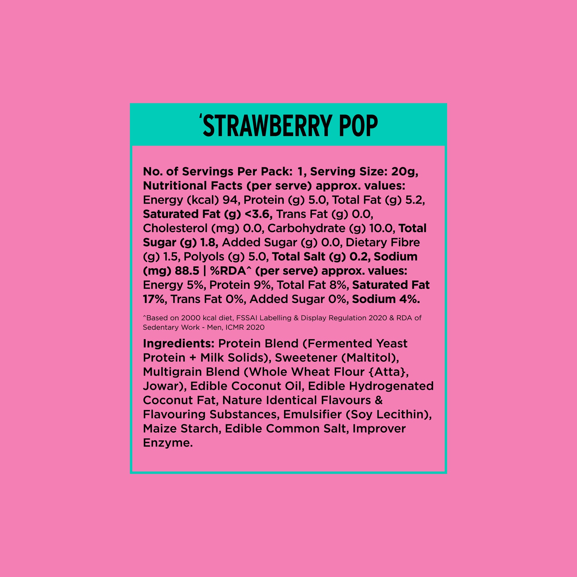 Crunchy high protein bars, 0% maida. Made with the goodness of millets & multigrain in a delicious strawberry pop flavour.
