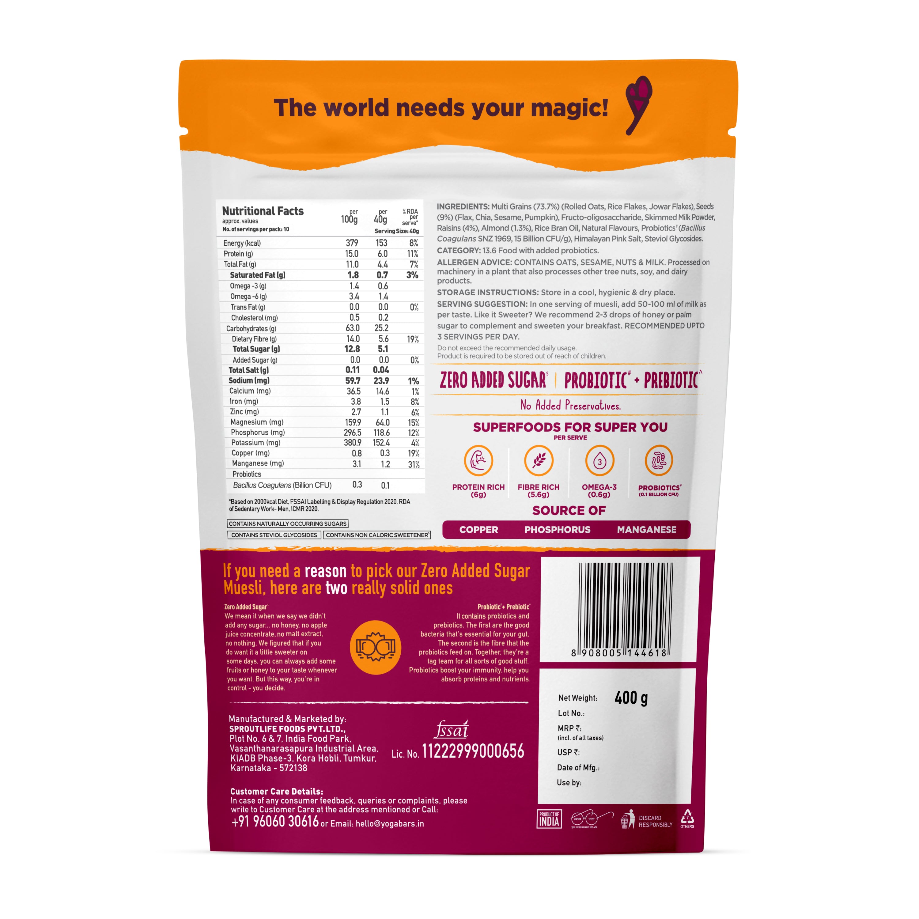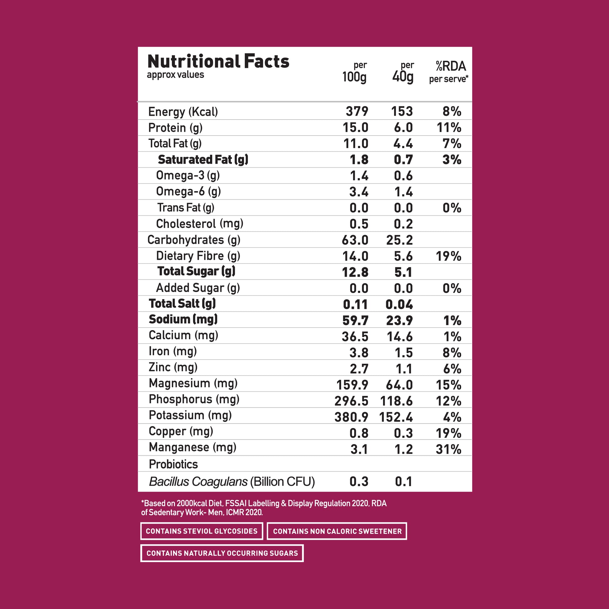 The product is full of goodness it contains whole grains almonds and super seeds.The product is gluten free and without any sugar and artificial preservatives.It is good to kick start your day.