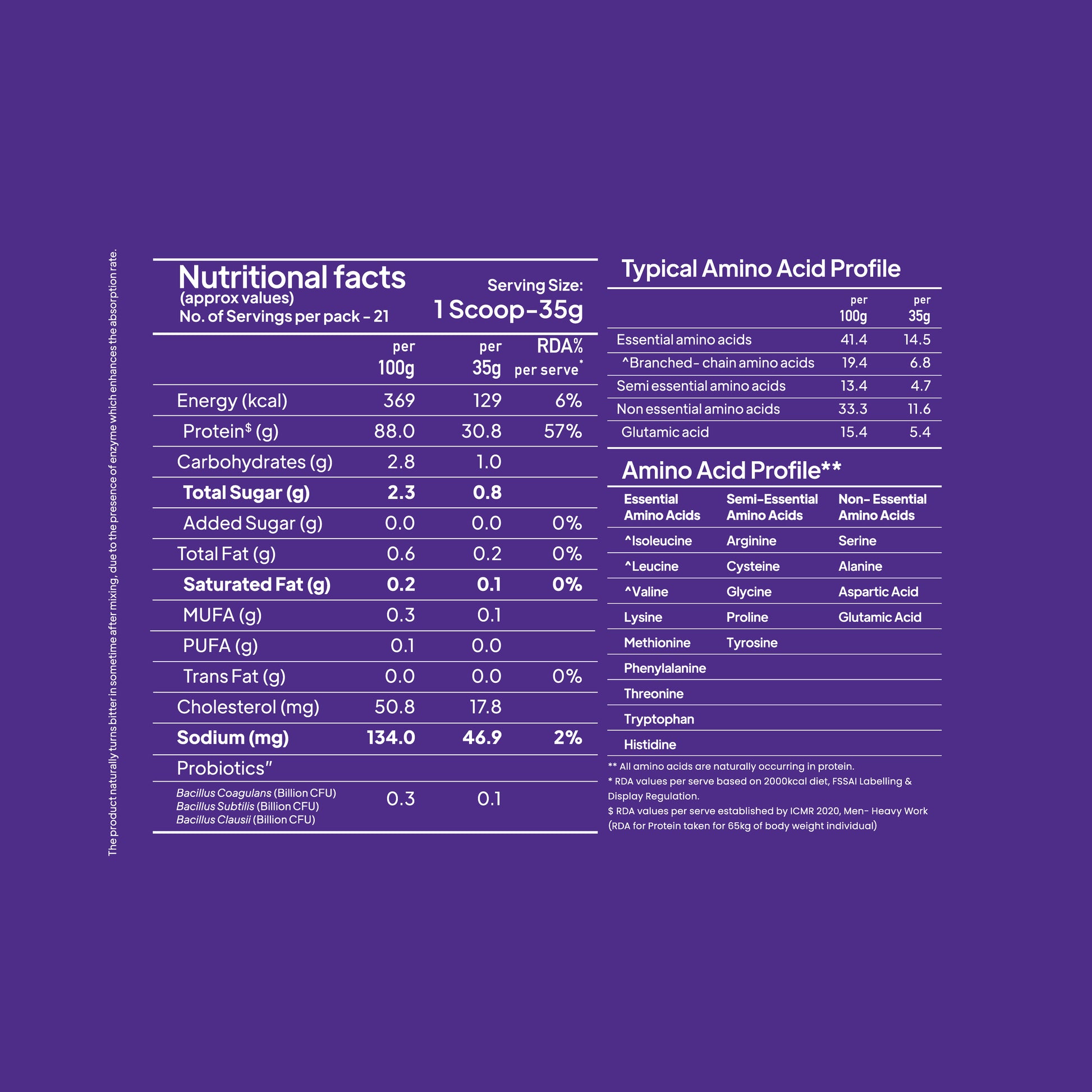 30g protein per scoop, Trustified certified for label accuracy. Made with a patented enzyme blend and added probiotics to support easy digestion β no bloating, no discomfort. No fillers, no additives, no preservatives. Just straightforward whey isolate that works as hard as you do.